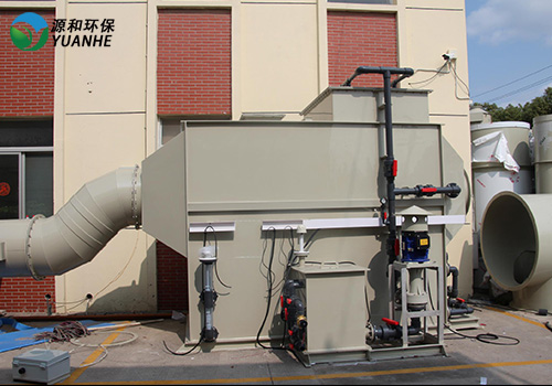 臥式洗滌塔,有害的廢氣從塔體的側(cè)部進入,臥式洗滌塔內(nèi)部設有一定高度的填料層廢氣自橫穿過填料層,最后從塔另外一側(cè)排出。同時從塔體的上部設有噴淋系統(tǒng),利用清水作循環(huán)吸收液,循環(huán)水從塔體的上部的布水器噴淋至填料層潤濕填料表面形成流動的液膜。填料層內(nèi)氣、液兩相呈逆流流動,氣液兩項在塔內(nèi)逆流接觸,利用有害廢氣在吸收劑中的一定的溶解度,可溶的組分不斷溶入吸收液中,達到降低氣體中有害組分含量的目的。配添加適當量的藥劑,有害廢氣不斷被吸收或是被化學反應去除掉,因此在水平氣流中的濃度愈來愈低,到塔側(cè)部時達到吸收要求排出塔外。